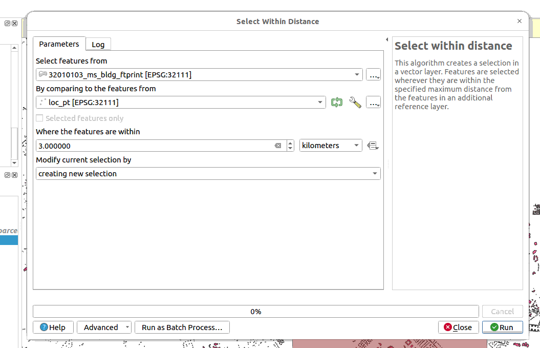 In the dialog box fill in the necessary layers. You can specify the distance. In this example we are using a point as the reference layer, and we are selecting from a polygon layer that are the building footprints.