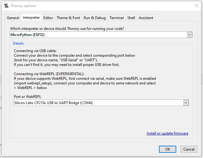 $ esptool --chip esp32 --port COMx erase_flash $ esptool --chip esp32 --port COMx --baud 460800 write_flash -z 0x1000 <micropython_firmware>.binWith Micropython install on your board. We can write some codes with the Thonny IDE. Download the Thonny IDE here.