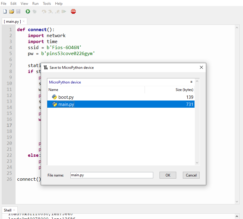 Once chosen, the shell will show it is connected to the Micropython on the HUZZAH32.