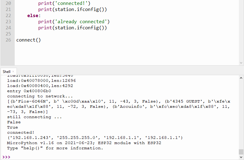 def connect(): import network import time ssid = b'your ssid name' pw = b'your password' station = network.WLAN(network.STA_IF) if station.isconnected() == False: print('connecting to network...') station.active(True) # wifi_networks = station.scan() # status = station.status() station.connect(ssid, pw) print('still connecting ...') while station.isconnected() == False: time.sleep(3) print('connected!') print(station.ifconfig()) else: print('already connected') print(station.ifconfig()) connect()