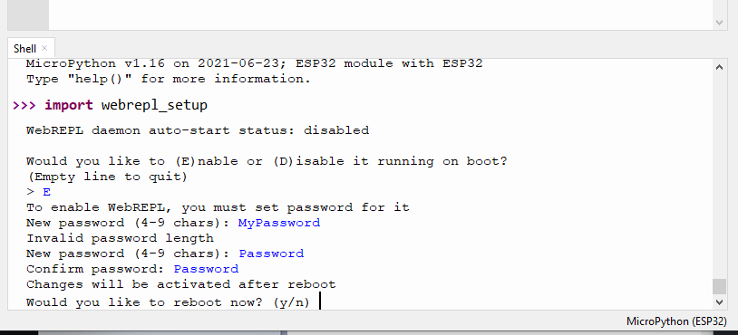 import webrepl_setupCheck the boot.py file these two lines of code will be uncommented.