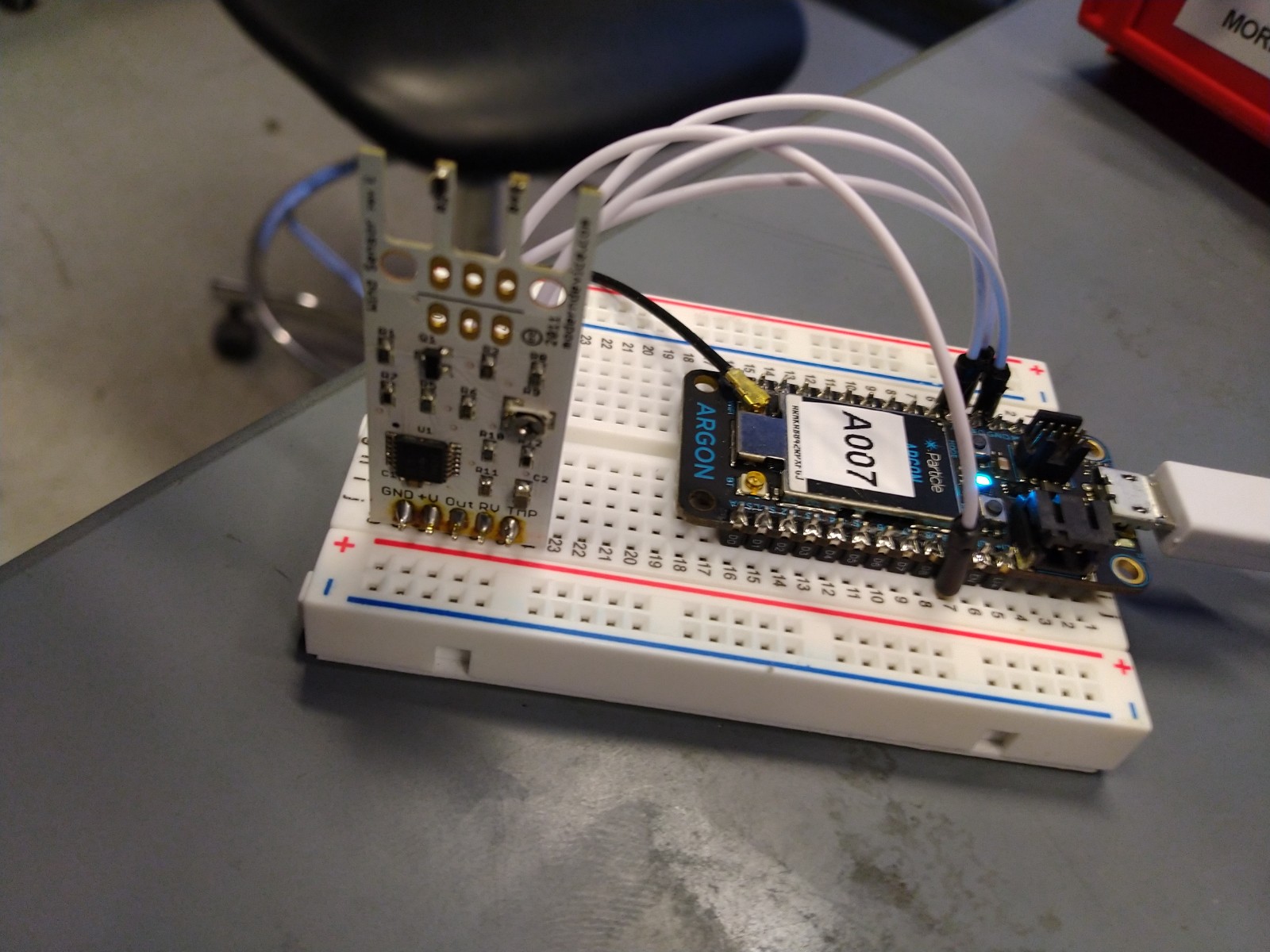 Wind Sensor <---> Photon/ Argon GND <----------------> GND +V <----------------> USB RV <----------------> A0 TMP <----------------> A1