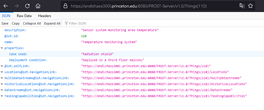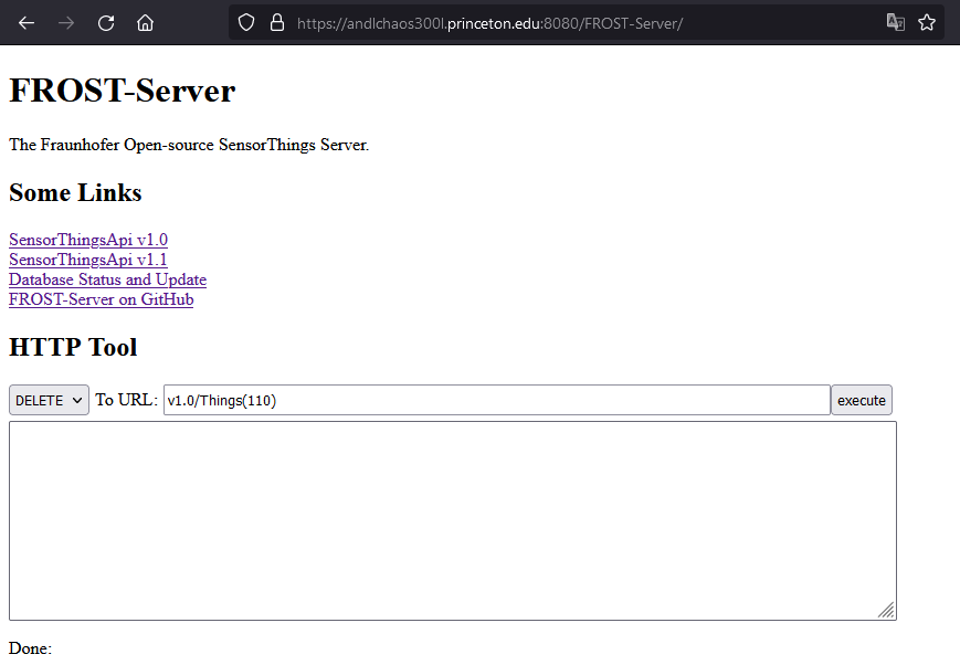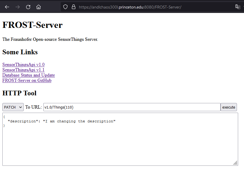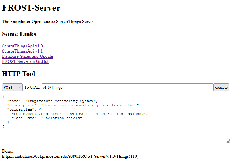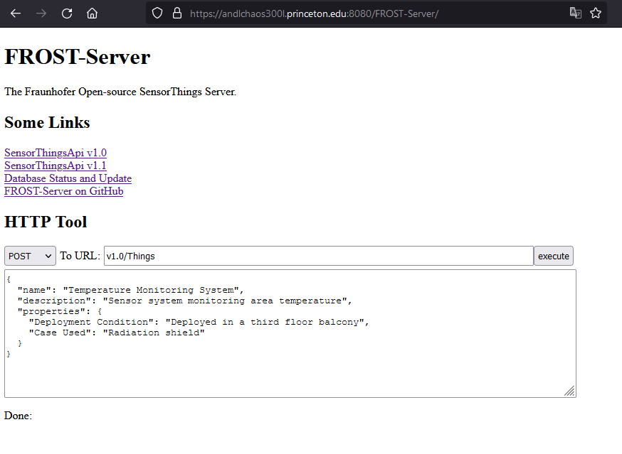 https://andlchaos300l.princeton.edu:8080/FROST-Server/v1.0/Things(1)Now let’s post a new Thing to the database using the in-built http tool of FROST-Server. Go to https://