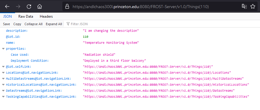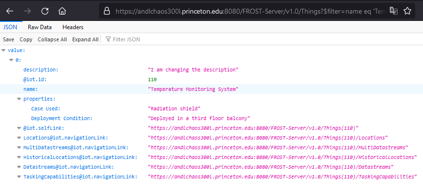 https://andlchaos300l.princeton.edu:8080/FROST-Server/v1.0/Things?$filter=name eq 'Temperature Monitoring System' and description eq 'I am changing the description'